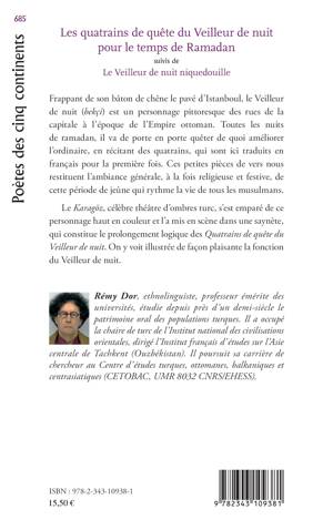 Le Veilleur de nuit est un personnage pittoresque des rues de la capitale à l'époque de l'Empire ottoman. Toutes les nuits de ramadan, il va de porte en porte en récitant des quatrains, qui sont ici traduits en français pour la première fois. Ces petites pièces de vers nous restituent l'ambiance générale, à la fois religieuse et festive, de cette période de jeûne qui rythme la vie de tous les musulmans. Une saynète, rendant hommage au théâtre d'ombres turc, constitue le prolongement des quatrains. On y voit illustrée de façon plaisante la fonction du Veilleur de nuit.