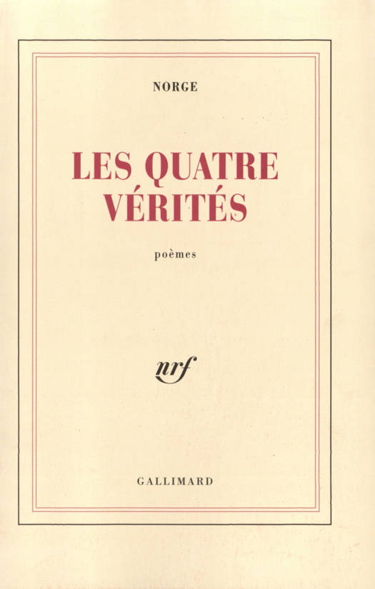 La quête des vérités pour le poète dépasse celles qui stagnent dans l'apparence, et cette entreprise désespérée forme l'objet même de la poésie. "Je leur dirai leurs quatre vérités" s'exclame la spontanéité populaire, tandis que Victor Hugo ajoute : "La vérité finit toujours par être inconnue". Les quatre Vérités de Norge nous proposent quelques aspects passionnés d'un réel aux multiples facettes et tentent d'aller parfois jusqu'à ce haut point de musique où la voix s'éprend du silence. Poèmes animés d'un opiniâtre amour de la vie qu'exalte cette forme drue et nette, rigoureuse et musicienne qui appartient à Norge.