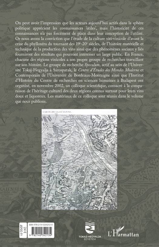 On peut avoir l'impression que les acteurs aujourd'hui actifs dans la sphère politique apprécient les connaissances 'utiles', mais l'historicité de ces connaissances n'a pas forcément de place dans leur conception de l'utilité. Or nous avons la conviction que l'étude de la culture viti-vinicole d'avant la crise du phylloxéra du tournant des 19e-20e siècles, de l'histoire matérielle et technique de la production des vins ainsi que des phénomènes sociaux y liés fourniront des résultats qui pourront intéresser un large public. En France, chacune des régions vinicoles a son propre groupe de recherches travaillant sur son histoire. Le groupe de recherche Speculum, actif au sein de l'Université Tokaj-Hegyalja à Sárospatak, le Centre d'Études des Mondes Moderne et Contemporain de l'Université de Bordeaux-Montaigne ainsi que l'Institut d'Histoire du Centre de recherches en sciences humaines à Budapest ont organisé, en novembre 2002, un colloque scientifique, consacré à la comparaison de l'héritage culturel des deux régions connus surtout pour leurs vins doux et liquoreux. Les matériaux de ce colloque sont réunis dans le volume que nous publions.
