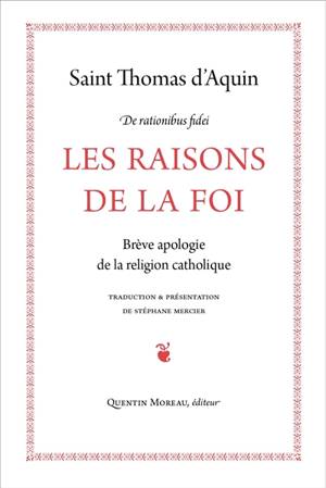 Les raisons de la foi, suivi de la Lettre à dom Bernard, abbé du Mont-Cassin. Comment Dieu peut-il avoir un Fils ? Comment le Saint-Esprit est-il Dieu ? Comment Dieu a-t-il pu s'incarner ? Comment peut-on manger le Corps de Jésus-Christ ? Y a-t-il un Purgatoire ? Comment concilier prédestination et liberté humaine ?... Autant de questions auxquelles il n'est pas toujours facile de répondre quand elles sont objectées contre la foi, en particulier par l'islam. Saint Thomas donne ici des arguments rationnels, à même de manifester la grande convenance du dogme catholique, de détruire les objections, et ainsi de rendre raison de la foi et de l'espérance qui est en nous (1 Petr 3, 15). Un peu éclipsés par les autres oeuvres magistrales du Docteur angélique, ces deux opuscules sont cependant très appréciés pour leur justesse, leur lumière et leur concision. On y trouve la grande délicatesse du Saint, soucieux de satisfaire ses amis désireux de vérité.