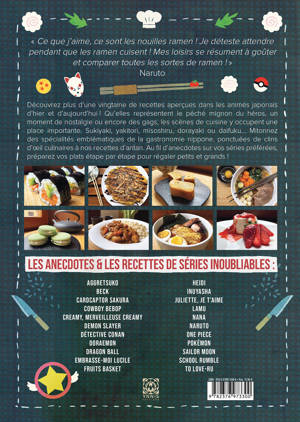 Découvrez plus d’une vingtaine de recettes aperçues dans les animés japonais d’hier et d’aujourd’hui ! Qu’elles représentent le péché mignon du héros, un moment de nostalgie ou encore des gags, les scènes de cuisine y occupent une place importante. Sukiyaki, yakitori, misoshiru, dorayaki ou daifuku… Mitonnez des spécialités emblématiques de la gastronomie nippone, ponctuées de clins d’œil culinaires à nos recettes d’antan. Au fil d’anecdotes sur vos séries préférées, préparez vos plats étape par étape pour régaler petits et grands !