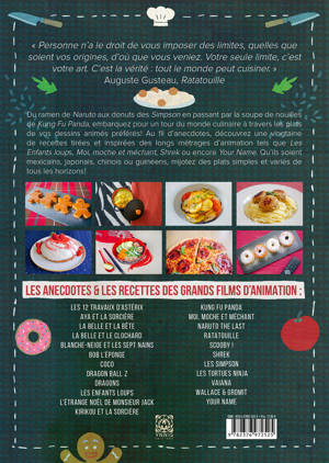 Du ramen de Naruto aux donuts des Simpson en passant par la soupe de nouilles de Kung Fu Panda, embarquez pour un tour du monde culinaire à travers les plats de vos dessins animés préférés ! Au fil d'anecdotes, découvrez une vingtaine de recettes tirées et inspirées des longs métrages d'animation tels que Les Enfants loups, Moi, moche et méchant, Shrek ou encore Your Name. Qu'Ils soient mexicains, japonais, chinois ou guinéens, mijotez des plats simples et variés de tous les horizons !