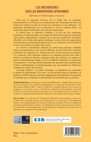 Les diverses contributions illustrent de quelle façon plusieurs méthodes peuvent contribuer à identifier les migrations en Afrique dans des environnements peu propices à la recherche. Elles montrent comment ces méthodes peuvent aider à obtenir de précieuses données empiriques dans des contextes où manque un cadre d'échantillonage adapté, et où il est difficile d'identifier et d'approcher les populations. L'ouvrage aborde aussi des questions d'ordres méthodologique et épistémologique.