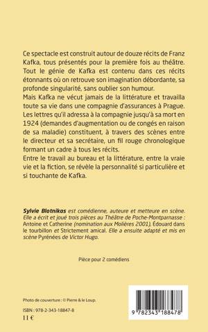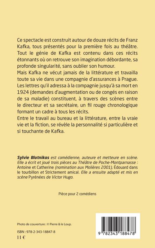 Cette pièce pour deux comédiens est construite autour de douze récits de Franz Kafka. Les lettres que cet auteur de génie adressa jusqu'à sa mort à la compagnie d'assurance où il travaillait constituent un fil rouge chronologique formant un cadre à tous les récits. Entre le travail de bureau et la littérature, entre la vraie vie et la fiction, se révèle la personnalité si particulière et si touchante de Kafka.