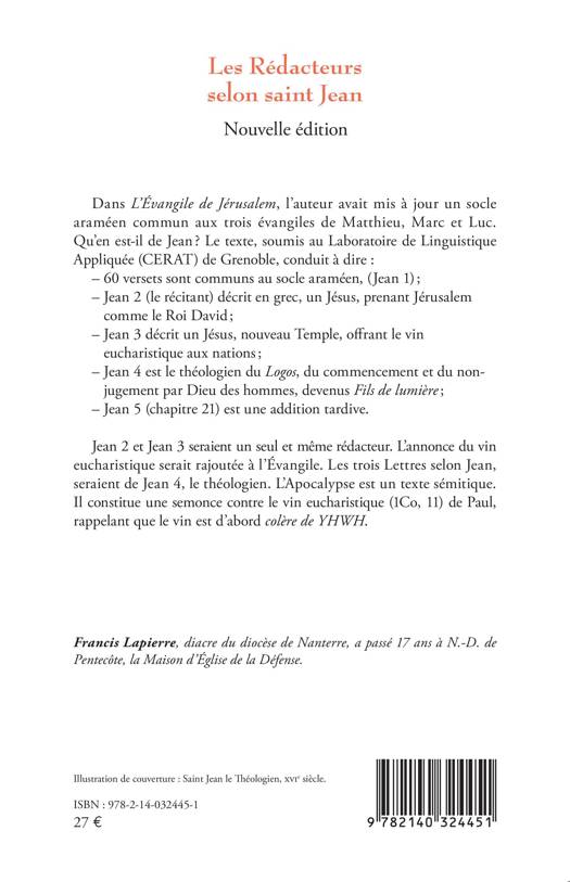 Dans L'Évangile de Jérusalem, l'auteur avait mis à jour un socle araméen commun aux trois évangiles de Matthieu, Marc et Luc. Qu'en est-il de Jean ? Le texte, soumis au Laboratoire de Linguistique Appliquée (CERAT) de Grenoble, conduit à dire: - 60 versets sont communs au socle araméen, (Jean 1); - Jean 2 (le récitant) décrit en grec, un Jésus, prenant Jérusalem comme le Roi David; - Jean 3 décrit un Jésus, nouveau Temple, offrant le vin eucharistique aux nations; - Jean 4 est le théologien du Logos, du commencement et du non-jugement par Dieu des hommes, devenus Fils de lumière; - Jean 5 (chapitre 21) est une addition tardive. Jean 2 et Jean 3 seraient un seul et même rédacteur. L'annonce du vin eucharistique serait rajoutée à l'Évangile. Les trois Lettres selon Jean, seraient de Jean 4, le théologien. L'Apocalypse est un texte sémitique. Il constitue une semonce contre le vin eucharistique (1Co, 11) de Paul, rappelant que le vin est d'abord colère de YHWH.