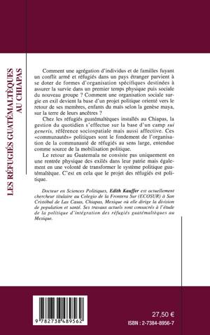Comment une organisation sociale surgie en exil devient la base d'un projet politique orienté vers le retour de ses membres, sur la terre de leurs ancêtres. Chez les réfugiés guatémaltèques installés au Chiapas, la gestion du quotidien s'effectue sur la base d'un camp sui generis, référence sociospatiale mais aussi affective. Le retour au Guatemala ne consiste pas uniquement en une rentrée physique mais surtout en une volonté de transformer le système politique.