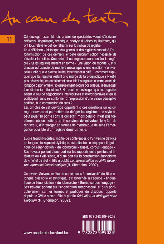 Les articles de cet ouvrage, écrits par des spécialistes d'horizons divers, apportent à la question des registres dits " littéraires " un éclairage nouveau. Les registres y sont considérés comme des actes de langage à part entière et envisagés dans leur dimension illocutoire. Chacun montre, sur un corpus précis, comment les registres, une fois " dé-figés " et dégagés d'une vision perceptive codifiée, participent à la construction du sens, à la dynamique du discours, voire à l'émergence du style.