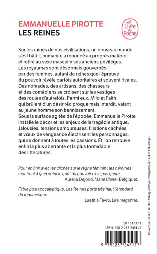 Sur les ruines de nos civilisations, un nouveau monde s’est bâti. L’humanité a renoncé au progrès matériel et retiré au sexe masculin ses anciens privilèges. Les royaumes sont désormais gouvernés par des femmes, autant de Reines que l’épreuve du pouvoir révèle parfois autoritaires et souvent rivales. Des nomades, des artisans, des chasseurs et des comédiens se croisent sur les vestiges des routes d’autrefois. Parmi eux, Milo et Faith, qui brûlent d’un désir réciproque mais interdit, valant au jeune homme son bannissement. Sous la surface agitée de l’épopée, Emmanuelle Pirotte installe le décor et les enjeux de la tragédie antique. Jalousies, tensions amoureuses, filiations cachées et vœux de vengeance électrisent les personnages qui se donnent à toutes les passions. Et l’on retrouve enfin la plus aberrante et la plus formidable des littératures.