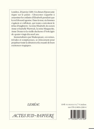 Londres, 20 janvier 1483. Un climat d'épouvante règne sur le palais : Gloucester s'apprête à assassiner les enfants d'Elisabeth pendant que le roi Edouard agonise. Dans la tour, six femmes s'agitent et s'affolent, qui toutes convoitent le trône d'Angleterre : la reine Elisabeth, les soeurs Anne et Isabelle Warwick, la reine Marguerite, Anne Dexter et la vieille duchesse d'York âgée de quatre-vingt-dix-neuf ans.