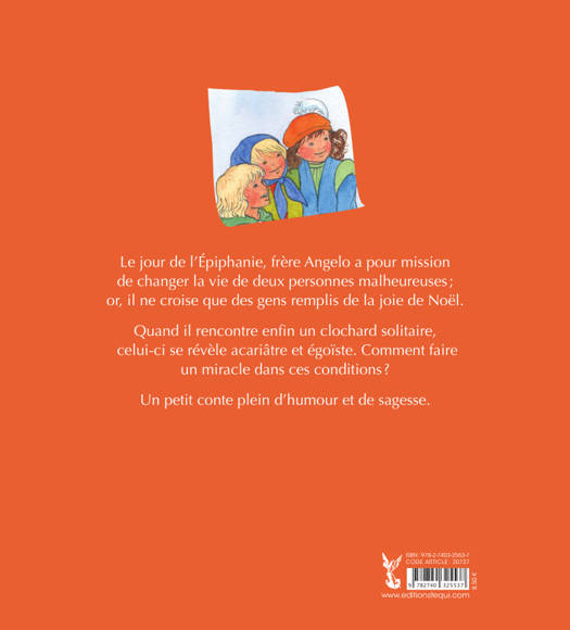 En ce jour de l'Épiphanie, frère Angelo est envoyé en mission : comme les Rois mages chargés de cadeaux, il a le pouvoir de faire deux miracles pour changer la vie de personnes malheureuses et solitaires. Il se met en route, mais tous ceux qu'il croise rayonnent de la joie de Noël. Enfin, il rencontre sous un pont un clochard malheureux et solitaire , il fait apparaître pour lui un festin somptueux. Hélas, l'homme se révèle irrémédiablement grincheux, insatisfait, égoïste et méchant ! Heureusement, frère Angelo a encore un miracle à réaliser… Un conte original et amusant qui fait réfléchir sur la joie et sur la véritable richesse, celle qui vient du cœur.