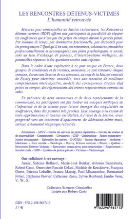 Les Rencontres détenus-victimes (RDV) offrent aux participants la possibilité de réparer les souffrances qui n'ont pas été prises en compte durant le procès pénal. Deux groupes de condamnés et de victimes, anonymes, se sont retrouvés chaque semaine, au sein de la Maison centrale de Poissy pour cheminer, ensemble, vers une tentative de meilleure compréhension intersubjective, au-delà des conséquences directes déjà prises en compte, des répercussions des crimes respectivement commis ou subis.