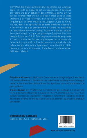 L'ouvrage interroge d'un point de vue strictement linguistique le texte théâtral de Jean Luc Lagarce "Juste la fin du monde", et plus précisément à travers les modalités de la représentation de l'oral qu'il construit tant sur le plan énonciatif que typographique et syntaxique. Si la langue ici montrée emprunte à l'oral ordinaire des formes linguistiques qui rendent saillante la discontinuité du flux de paroles spontané, dans le même temps, elle exhibe également la continuité du fil du discours qui se voit toujours relancé.
