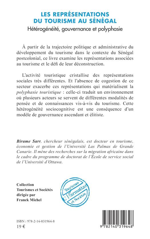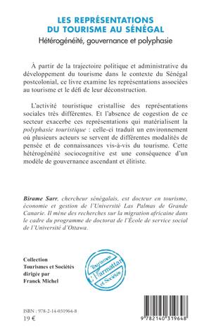 À partir de la trajectoire politique et administrative du développement du tourisme dans le contexte du Sénégal postcolonial, ce livre examine les représentations associées au tourisme et le défi de leur déconstruction. L'activité touristique cristallise des représentations sociales très différentes. Et l'absence de cogestion de ce secteur exacerbe ces représentations qui matérialisent la polyphasie touristique: celle-ci traduit un environnement où plusieurs acteurs se servent de différentes modalités de pensée et de connaissances vis-à-vis du tourisme. Cette hétérogénéité sociocognitive est une conséquence d'un modèle de gouvernance ascendant et élitiste.