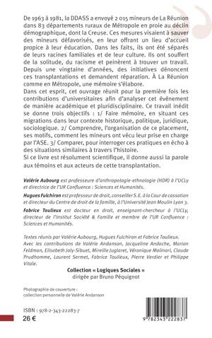 De 1963 à 1981, la DDASS a envoyé 2 015 mineurs de La Réunion dans 83 départements ruraux de Métropole en proie au déclin démographique, dont la Creuse. Ces mesures visaient à sauver des mineurs défavorisés. Dans les faits, ils ont été séparés de leurs racines familiales et de leur culture. Depuis une vingtaine d’années, des initiatives dénoncent ces transplantations. Dans cet esprit, cet ouvrage réunit les contributions d’universitaires afin d’analyser cet événement de manière académique. Ce travail se donne trois objectifs : 1/Faire mémoire 2/ Comprendre, l’organisation de ce placement..3/ Comparer, pour interroger ces pratiques en écho à des situations similaires à travers l’histoire. Si ce livre est résolument scientifique, il donne aussi la parole aux témoins et aux acteurs de cette transplantation.