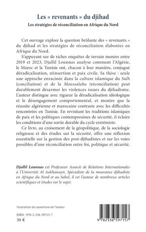 Cet ouvrage explore la question brûlante des revenants du djihad et les stratégies de réconciliation élaborées en Afrique du Nord. S'appuyant sur de riches enquêtes de terrain menées entre 2019 et 2023, Djallil Lounnas analyse comment l'Algérie, le Maroc et la Tunisie ont, chacun à leur manière, conjugué déradicalisation, réinsertion et paix civile. Sa thèse: seule une approche enracinée dans la culture islamique du Sulh (conciliation) et de la Moussalaha (réconciliation) peut durablement désarmer les violences issues du djihadisme. L'auteur distingue avec rigueur la déradicalisation idéologique et le désengagement comportemental, et montre que la réussite algérienne et marocaine contraste avec les difficultés rencontrées en Tunisie. En revisitant les traditions islamiques de paix et les politiques contemporaines de sécurité, il éclaire les conditions d'une sortie durable du cycle extrémiste. Ce livre, au croisement de la géopolitique, de la sociologie religieuse et des études sur la sécurité, offre une réflexion essentielle sur la gestion des post-djihadistes et sur les voies possibles d'une réconciliation entre foi, politique et sécurité.
