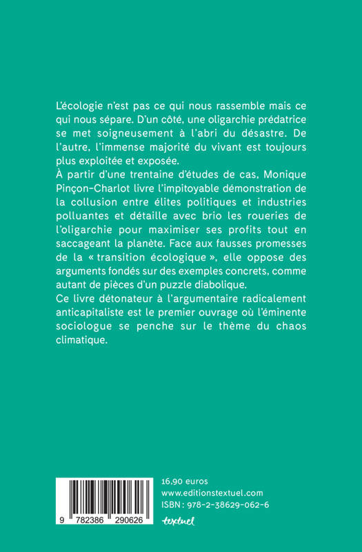 L'écologie n'est pas ce qui nous rassemble mais ce qui nous sépare. D'un côté, une oligarchie prédatrice se met soigneusement à l'abri du désastre. De l'autre, l'immense majorité du vivant est toujours plus exploitée et exposée. À partir d'une trentaine d'études de cas, Monique Pinçon-Charlot livre l'impitoyable démonstration de la collusion entre élites politiques et industries polluantes et détaille avec brio les roueries de l'oligarchie pour maximiser ses profits tout en saccageant la planète. Face aux fausses promesses de la « transition écologique », elle oppose des arguments fondés sur des exemples concrets, comme autant de pièces d'un puzzle diabolique. Ce livre détonateur à l'argumentaire radicalement anticapitaliste est le premier ouvrage où l'éminente sociologue se penche sur le thème du chaos climatique.