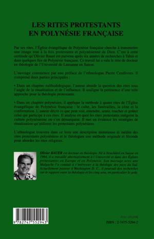 Par ses rites, l'Église évangélique de Polynésie française cherche à transmettre une image tout à la fois protestante et polynésienne de Dieu. C'est à cette certitude qu'Olivier Bauer est parvenu après six années de recherches à Tahiti et dans quelques îles de Polynésie française. Ce travail lui a valu le titre de docteur en théologie de l'Université de Lausanne en Suisse.
