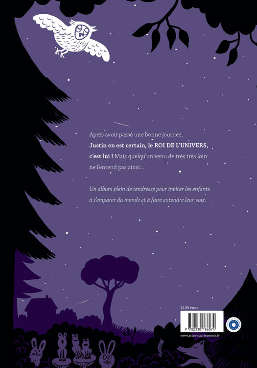 Après avoir passé une bonne journée, Justin se couche heureux, il en est persuadé : le roi de l'univers, c'est lui ! Mais à peine endormi, il est réveillé en sursaut par un vaisseau spatial qui s'est posé au milieu de son jardin. Un petit garçon qui vient de la planète Trucmuche Machin Machin le cherche : il lui annonce qu'en fait c'est lui, le roi de l'univers ! Et deux rois sur le même trône, ça n'est pas possible, il faut choisir. Après avoir envisagé de multiples solutions, Justin trouve enfin la bonne idée, que tous les enfants fassent entendre leur voix en devenant les rois et les reines de leur bout d'univers.