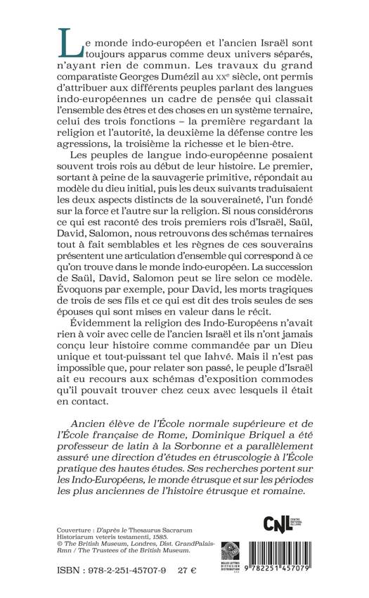 Le monde indo-europeen et l'ancien Israel sont toujours apparus comme deux univers separes, n'ayant rien de commun. Les travaux du grand comparatiste Georges Dumezil au XXe siecle, ont permis d'attribuer aux differents peuples parlant des langues indo-europeennes un cadre de pensee qui classait l'ensemble des etres et des choses en un systeme ternaire, celui des trois fonctions - la premiere regardant la religion et l'autorite, la deuxieme la defense contre les agressions, la troisieme la richesse et le bien-etre. Les peuples de langue indo-europeenne posaient souvent trois rois au debut de leur histoire. Le premier, sortant a peine de la sauvagerie primitive, repondait au modele du dieu initial, puis les deux suivants traduisaient les deux aspects distincts de la souverainete, l'un fonde sur la force et l'autre sur la religion. Si nous considerons ce qui est raconte des trois premiers rois d'Israel, Saul, David, Salomon, nous retrouvons des schemas ternaires tout a fait semblables et les regnes de ces souverainspresentent une articulation d'ensemble qui correspond a ce qu'on trouve dans le monde indo-europeen. La succession de Saul, David, Salomon peut se lire selon ce modele. Evoquons par exemple, pour David, les morts tragiques de trois de ses fils et ce qui est dit des trois seules de ses epouses qui sont mises en valeur dans le recit. Evidemment la religion des Indo-Europeens n'avait rien a voir avec celle de l'ancien Israel et ils n'ont jamais concu leur histoire comme commandee par un Dieu unique et tout-puissant tel que Iahve. Mais il n'est pas impossible que, pour relater son passe, le peuple d'Israel ait eu recours aux schemas d'exposition commodes qu'il pouvait trouver chez ceux avec lesquels il etait en contact.