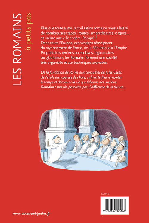 En quelques siècles, Rome est passée du statut de simple village à celui de capitale d'un immense empire qui a rayonné sur toute la Méditerranée. Par la conquête, elle a diffusé sa culture et son mode de vie, notamment en Gaule et en Égypte. Comment vivaient les Romains ? De la République à l'Empire, de l'organisation politique à la religion en passant par le commerce, l'éducation, l'agriculture, les jeux, la guerre... Les Romains à petits pas explique le fonctionnement de cette société qui a laissé de nombreuses traces et qui a considérablement influencé la nôtre.