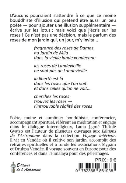 D’aucuns pourraient s’attendre à ce que ce moine bouddhiste d’illusion qui prétend être aussi un peu poète —â pour ajouter une illusion supplémentaireâ — écrive sur les lotusâ ; mais voici que j’écris sur les rosesâ ! Ce n’est pas une décision, mais le parfum des roses de mon jardin qui, un jour, m’y invita... fragrance des roses de Damas au Jardin de Mila dans la vieille lande vendéenne les roses de Landevieille ne sont pas de Landevieille la liberté est là dans les roses que l’on voit et dans celles qu’on ne voit... cherchez les roses trouvez les rosesâ — l’introuvable réalité des roses Illustration de : Aude Jessemin (couverture), Anne Auvinet, Adriana Bonomi, Isabelle Caduda, Marion Clavel, Dominique Malardé
