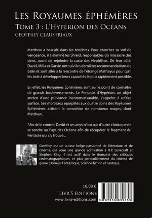 Matthew a basculé dans les ténèbres. Pour étancher sa soif de vengeance, il a éliminé les Shreid, responsables du massacre des siens, avant de rejoindre la caste des Nephilims. De leur côté, David, Milia et Garvin ont suivi les dernières recommandations de Balin et sont allés à la rencontre de l’étrange Mathayus pour qu’il les aide à développer leurs capacités le plus rapidement possible. En effet, les Royaumes Éphémères sont sur le point de connaître de grands bouleversements. Le Pentacle d’Hypérion, un objet ancien d’une puissance incommensurable, s’apprête à refaire surface. Ses morceaux éparpillés aux quatre coins des Royaumes Éphémères attisent la convoitise de nombreux mages, dont Matthew. Afin de le contrer, David et ses amis n’ont pas d’autre choix que de se rendre au Pays des Océans afin de récupérer le fragment du Pentacle qui s’y trouve…