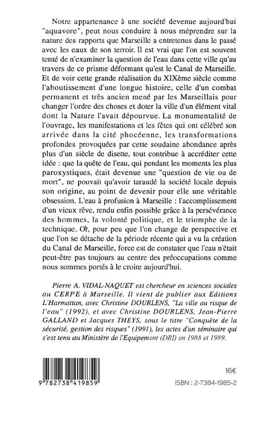 Notre appartenance à une société devenue aujourd'hui "aquavore", peut nous conduire à nous méprendre sur la nature des rapports que Marseille a entretenus dans le passé avec les eaux de son terroir. Il est vrai que l'on est souvent tenté de n'examiner la question de l'eau dans cette ville qu'au travers de ce prisme déformant qu'est le Canal de Marseille. Et de voir cette grande réalisation du XIXème siècle comme l'aboutissement d'une longue histoire, celle d'un combat permanent et très ancien mené par les Marseillais pour changer l'ordre des choses et doter la ville d'un élément vital dont la Nature l'avait dépourvue. La monumentalité de l'ouvrage, les manifestations et les fêtes qui ont célébré son arrivée dans la cité phocéenne, les transformations profondes provoquées par cette soudaine abondance après plus d'un siècle de disette, tout contribue à accréditer cette idée : que la quête de l'eau, qui pendant les moments les plus paroxystiques, était devenue une "question de vie ou de mort", ne pouvait qu'avoir taraudé la société locale depuis son origine, au point de devenir pour elle une véritable obsession. L'eau à profusion à Marseille : l'accomplissement d'un vieux rêve, rendu enfin possible grâce à la persévérance des hommes, la volonté politique, et le triomphe de la technique. Or, pour peu que l'on change de perspective et que l'on se détache de la période récente qui a vu la création du Canal de Marseille, force est de constater que l'eau n'était peut-être pas toujours au centre des préoccupations comme nous sommes portés à le croire aujourd'hui.