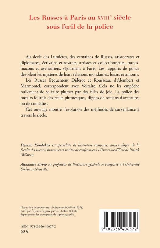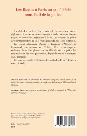Au siècle des Lumières, des centaines de Russes, aristocrates et diplomates, écrivains et savants, artistes et collectionneurs, francs-maçons et aventuriers, séjournent à Paris. Les rapports de police dévoilent les mystères de leurs relations mondaines, loisirs et amours. Les Russes fréquentent Diderot et Rousseau, d’Alembert et Marmontel, correspondent avec Voltaire. Cela ne les empêche nullement de se faire plumer par des filles de joie. La police des mœurs fournit des récits pittoresques, dignes de romans d’aventures ou de comédies. Cet ouvrage montre l’évolution des méthodes de surveillance à travers le siècle.