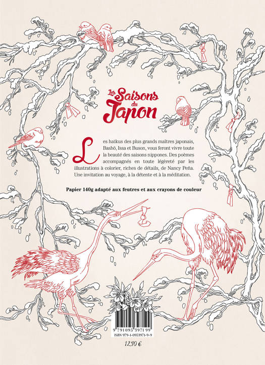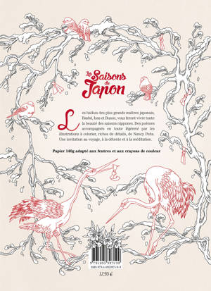Coloriez de très belles illustrations originales de l’autrice Nancy Peña et méditez avec les haïkus les accompagnant. Un voyage zen à travers les quatre saisons, de la floraison des cerisiers jusqu’à l’automne et ses feuilles d’érable rouge. ⢠Un hymne aux saisons du Japonâ: Les quatre saisons sont mises à l’honneur à travers une sélection de haïkus et d’illustrations noir et blanc d’une grande finesse. ⢠Des illustrations originales et de qualité : Des illustrations soignées et pensées en fonction des haïkus, loin des illustrations de “banque d’images” ou des simples estampes mal décalquées que peuvent proposer les autres livres de coloriages adultes. ⢠Un papier épais adapté au coloriage aux feutres et aux crayons de couleur ⢠Bien plus qu’un simple livre de coloriage : Un livre qui se colorie, se regarde, se lit et se médite.