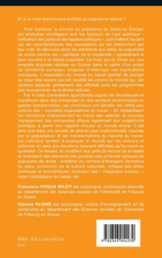 Et si la crise économique profitait au populisme radical? Dans cet ouvrage, l'exploration du monde du travail permet de plonger au coeur des raisons qui ont modifié les visions du monde qui, par certains aspects, présentent des affinités avec les programmes des mouvements de la droite radicale. Par le biais d'entretiens approfondis auprès d'employés dans des secteurs économiques en grande transformation, les chercheurs ont dévoilé des effets peu connus des "nouvelles organisations du travail".