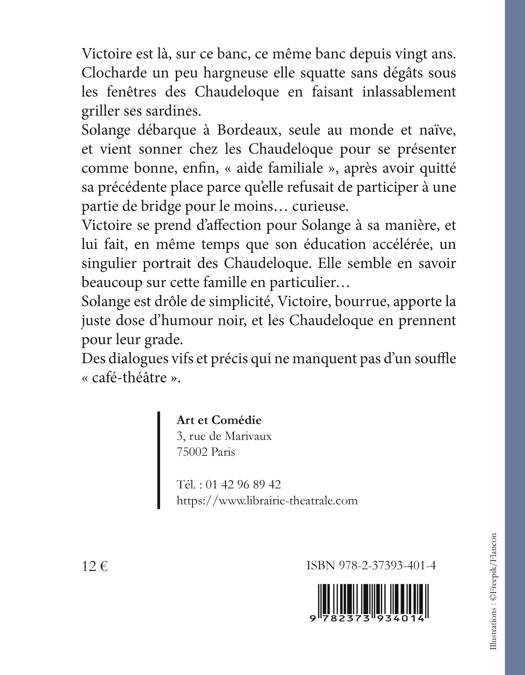 Victoire est là, sur ce banc, ce même banc depuis vingt ans. Clocharde un peu hargneuse elle squatte sans dégâts sous les fenêtres des Chaudeloque en faisant inlassablement griller ses sardines. Solange débarque à Bordeaux, seule au monde et naïve, et vient sonner chez les Chaudeloque pour se présenter comme bonne, enfin, « aide familiale », après avoir quitté sa précédente place parce qu'elle refusait de participer à une partie de bridge pour le moins... curieuse. Victoire se prend d'affection pour Solange à sa manière, et lui fait, en même temps que son éducation accélérée, un singulier portrait des Chaudeloque. Elle semble en savoir beaucoup sur cette famille en particulier... Solange est drôle de simplicité, Victoire, bourrue, apporte la juste dose d'humour noir, et les Chaudeloque en prennent pour leur grade. Des dialogues vifs et précis qui ne manquent pas d'un souffle « café-théâtre ».