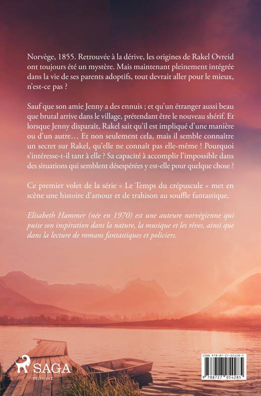 Norvège, 1855. Retrouvée à la dérive, les origines de Rakel Ovreid ont toujours été un mystère. Mais maintenant pleinement intégrée dans la vie de ses parents adoptifs, tout devrait aller pour le mieux, n'est-ce pas ? Sauf que son amie Jenny a des ennuis ; et qu'un étranger aussi beau que brutal arrive dans le village, prétendant être le nouveau shérif. Et lorsque Jenny disparaît, Rakel sait qu'il est impliqué d'une manière ou d'un autre... Et non seulement cela, mais il semble connaître un secret sur Rakel, qu'elle ne connaît pas elle-même ! Pourquoi s'intéresse-t-il tant à elle ? Sa capacité à accomplir l'impossible dans des situations qui semblent désespérées y est-elle pour quelque chose ? Ce premier volet de la série « Le Temps du crépuscule » met en scène une histoire d'amour et de trahison au souffle fantastique.