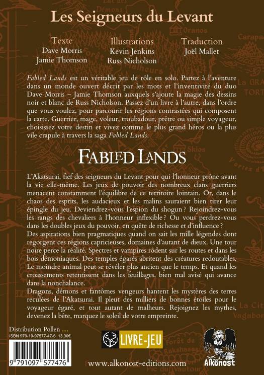 Fabled Lands est un véritable jeu de rôle en solo dans un monde totalement ouvert. Passez d’un livre à l’autre, dans l’ordre que vous voulez, pour parcourir les régions contrastées qui composent la carte. Guerrier, mage, voleur, troubadour, prêtre ou simple voyageur, choisissez votre destin et vivez comme le plus grand héros ou la plus vile crapule.<br /> Au fil des quêtes et de vos explorations, faites-vous des alliés et des ennemis, découvrez des lieux merveilleux, devenez plus fort, obtenez du matériel, achetez un navire, un équipage et même une maison, offrez-vous la bénédiction d’un dieu ou reniez-le pour un autre et parcourez les terres fabuleuses en toute liberté dans cette série de livres-jeux d’une richesse inédite. <br /> Dans ce tome, explorez l’Akatsurai, fief des seigneurs du Levant pour qui l’honneur prône avant la vie elle-même. Les jeux de pouvoir des nombreux clans guerriers menacent constamment l’équilibre de ce territoire lointain.