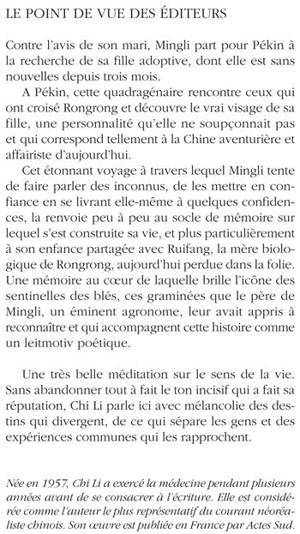 Contre l'avis de son mari, Mingli part pour Pékin à la recherche de sa fille adoptive, dont elle est sans nouvelles depuis trois mois. A Pékin, cette quadragénaire rencontre ceux qui ont croisé Rongrong et découvre le vrai visage de sa fille, une personnalité qu'elle ne soupçonnait pas et qui correspond tellement à la Chine aventurière et affairiste d'aujourd'hui. Cet étonnant voyage à travers lequel Mingli tente de faire parler des inconnus, de les mettre en confiance en se livrant elle-même à quelques confidences, la renvoie peu à peu au socle de mémoire sur lequel s'est construite sa vie, et plus particulièrement à son enfance partagée avec Ruifang, la mère biologique de Rongrong, aujourd'hui perdue dans la folie. Une mémoire au coeur de laquelle brille l'icône des sentinelles des blés, ces graminées que le père de Mingli, un éminent agronome, leur avait appris à reconnaître et qui accompagnent cette histoire comme un leitmotiv poétique. Une très belle méditation sur le sens de la vie. Sans abandonner tout à fait le ton incisif qui a fait sa réputation, Chi Li parle ici avec mélancolie des destins qui divergent, de ce qui sépare les gens et des expériences communes qui les rapprochent.
