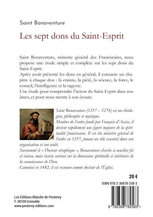 Saint Bonaventure nous propose un commentaire en 8 chapitres sur les sept dons du Saint-Esprit. Il présente tout d'abord ce que sont les dons du Saint-Esprit, puis il propose un chapitre par don : le don de crainte, le don de piété, le don de science, le don de force, le don de conseil, le don d'intelligence et enfin le don de sagesse. Il existe peu d'ouvrage pour expliquer ce que sont les dons de l'Esprit-Saint et leur action dans nos âmes. Saint Bonaventure a le mérite de mettre un texte simple mais néanmoins complet à notre portée. Le texte est utile pour apprendre, et il est également accessible pour servir de support à la prière.