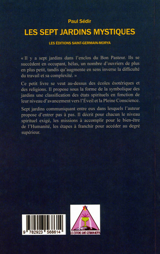 « Il y a sept jardins dans l'enclos du Bon Pasteur. Ils se succèdent en occupant, hélas, un nombre d'ouvriers de plus en plus petit, tandis qu'augmente en sens inverse la difficulté du travail et sa complexité. » Ce petit livre se veut au-dessus des écoles ésotériques et des religions. Il propose sous la forme de la symbolique des jardins une classification des états spirituels en fonction de leur niveau d’avancement vers l’Éveil et la Pleine Conscience. Sept jardins communiquant entre eux dans lesquels l’auteur propose d’entrer pas à pas. Il décrit pour chacun le niveau spirituel exigé, les missions à accomplir pour le bien-être de l’Humanité, les étapes à franchir pour accéder au degré supérieur.