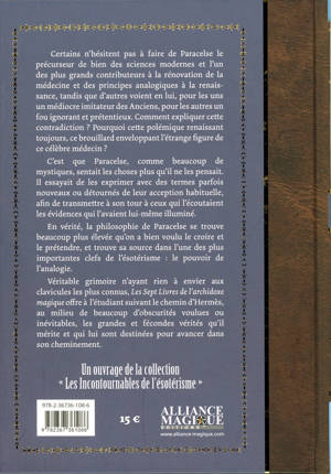 Certains n’hésitent pas à faire de Paracelse le précurseur de bien des sciences modernes et l’un des plus grands contributeurs à la rénovation de la médecine et des principes analogiques à la renaissance, tandis que d’autres voient en lui, pour les uns un médiocre imitateur des Anciens, pour les autres un fou ignorant et prétentieux. Comment expliquer cette contradiction ? Pourquoi cette polémique renaissant toujours, ce brouillard enveloppant l’étrange figure de ce célèbre médecin ? C’est que Paracelse, comme beaucoup de mystiques, sentait les choses plus qu’il ne les pensait. Il essayait de les exprimer avec des termes parfois nouveaux ou détournés de leur acception habituelle, afin de transmettre à son tour à ceux qui l’écoutaient les évidences qui l’avaient lui-même illuminé. En vérité, la philosophie de Paracelse se trouve beaucoup plus élevée qu’on a bien voulu le croire et le prétendre, et trouve sa source dans l’une des plus importantes clefs de l’ésotérisme : le pouvoir de l’analogie. Véritable grimoire n’ayant rien à envier aux clavicules les plus connus, Les Sept Livres de l’archidoxe magique offre à l’étudiant suivant le chemin d’Hermès, au milieu de beaucoup d’obscurités voulues ou inévitables, les grandes et fécondes vérités qu’il mérite et qui lui sont destinées pour avancer dans son cheminement. Un ouvrage de la collection « Les Incontournables de l’ésotérisme »