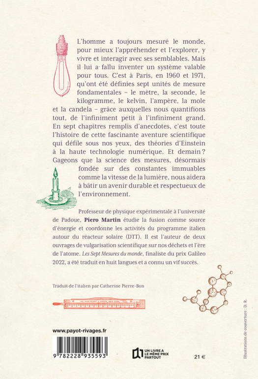 L'homme a toujours mesuré le monde, pour mieux l'appréhender et l'explorer, y vivre et interagir avec ses semblables. Mais il lui a fallu inventer un système valable pour tous. C'est à Paris, en 1960 et 1971, qu'ont été définies sept unités de mesure fondamentales - le mètre, la seconde, le kilogramme, le kelvin, l'ampère, la mole et la candela - grâce auxquelles nous quantifions tout, de l'infiniment petit à l'infiniment grand. En sept chapitres remplis d'anecdotes, c'est toute l'histoire de cette fascinante aventure scientifique qui défile sous nos yeux, des théories d'Einstein à la haute technologie numérique. Et demain ? Gageons que la science des mesures, désormais fondée sur des constantes immuables comme la vitesse de la lumière, nous aidera à bâtir un avenir durable et respectueux de l'environnement.