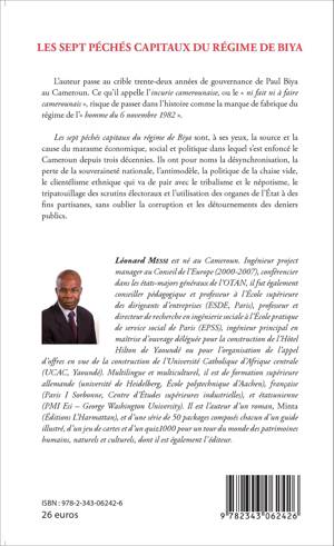 Les sept péchés capitaux du régime de Biya sont, pour l'auteur, la source et la cause du marasme économique, social et politique dans lequel s'est enfoncé le Cameroun depuis trois décennies. Ils ont pour noms la désynchronisation, la perte de la souveraineté nationale, l'antimodèle, la politique de la chaise vide, le clientélisme ethnique, le tripatouillage des scrutins électoraux et l'utilisation des organes de l'Etat à des fins partisanes, sans oublier la corruption et les détournements des deniers publics.