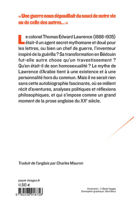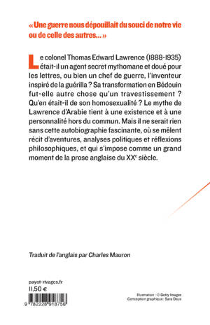 Le colonel Thomas Edward Lawrence (1888-1935) était-il un agent secret mythomane et doué pour les lettres, ou bien un chef de guerre, l'inventeur inspiré de la guérilla ? Sa transformation en Bédouin fut-elle autre chose qu'un travestissement ? Qu'en était- il de son homosexualité ? Le mythe de Lawrence d'Arabie tient à une existence et à une personnalité hors du commun. Mais il ne serait rien sans cette autobiographie fascinante, où se mêlent récit d'aventures, analyses politiques et réflexions philosophiques, et qui s'impose comme un grand moment de la prose anglaise du xxe siècle.