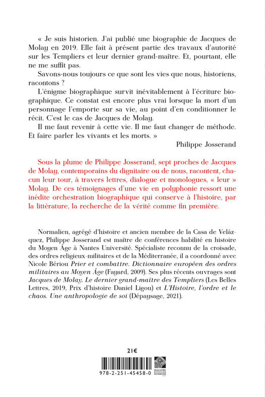 « Je suis historien. J’ai publié une biographie de Jacques de Molay en 2019. Elle fait à présent partie des travaux d’autorité sur les Templiers et leur dernier grand-maître. Et, pourtant, elle ne me suffit pas. Savons-nous toujours ce que sont les vies que nous, historiens, racontons ? L’énigme biographique survit inévitablement à l’écriture biographique.Ce constat est encore plus vrai lorsque la mort d’un personnage l’emporte sur sa vie, au point d’en conditionner le récit. C’est le cas de Jacques de Molay. Il me faut revenir à cette vie. Il me faut changer de méthode. Et faire parler les vivants et les morts. » Philippe Josserand