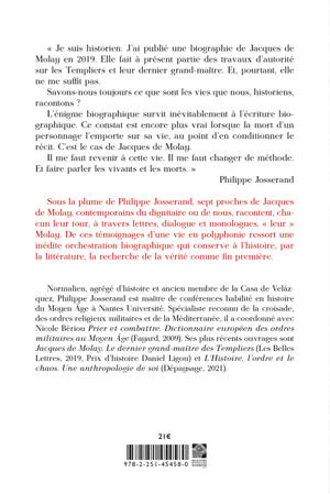 Sous la plume de Philippe Josserand, sept proches de Jacques de Molay, contemporains du dignitaire ou de nous, racontent, chacun leur tour, à travers lettres, dialogue et monologues, « leur » Molay. De ces témoignages d’une vie en polyphonie ressort une inédite orchestration biographique qui conserve à l’histoire, par la littérature, la recherche de la vérité comme fin première.