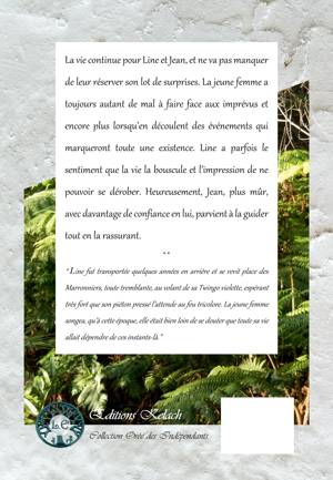 La vie continue pour Line et Jean, et ne va pas manquer de leur réserver son lot de surprises. La jeune femme a toujours autant de mal à faire face aux imprévus et encore plus lorsqu'en découlent des événements qui marqueront toute une existence. Line a parfois le sentiment que la vie la bouscule et l'impression de ne pouvoir se dérober. Heureusement, Jean, plus mûr, avec davantage de confiance en lui, parvient à la guider tout en la rassurant. « Line fut transportée quelques années en arrière et se revit place des Marronniers, toute tremblante, au volant de sa Twingo violette, espérant très fort que son piéton pressé l'attende au feu tricolore. La jeune femme songea, qu'à cette époque, elle était bien loin de se douter que toute sa vie allait dépendre de ces instants-là. »