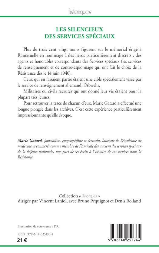 Plus de trois cent vingt noms figurent sur le mémorial érigé à Ramatuelle en hommage à des héros particulièrement discrets : des agents et honorables correspondants des Services spéciaux (les services de renseignement et de contre-espionnage qui ont fait le choix de la Résistance dès le 14 juin 1940). Ceux qui en faisaient partie étaient une cible spécialement visée par le service de renseignement allemand, l’Abwehr. Militaires ou civils recrutés qui ont donné leur vie étaient pour la plupart très jeunes. Pour retrouver la trace de chacun d’eux, Marie Gatard a effectué une longue plongée dans les archives. C’est cette expérience particulièrement impressionnante qu’elle évoque.