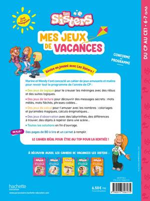 Révise en jouant avec Les Sisters ! Marine et Wendy t’ont concocté un cahier de jeux amusants et malins pour revoir tout le programme de l’année de CP : • Des jeux de logique pour te creuser les méninges avec des rébus et des suites logiques. • Des jeux de lecture pour découvrir des messages secrets : mots mêlés, mots fléchés, phrases codées… • Des jeux de calcul pour t’amuser avec les nombres : coloriages et pyramides magiques, calculs énigmatiques… • Des jeux d’observation avec des labyrinthes, des différences à trouver, des objets à repérer dans une scène... • Toutes les solutions en fin d’ouvrage. • Des pages de BDà lire et un carnet à remplir.