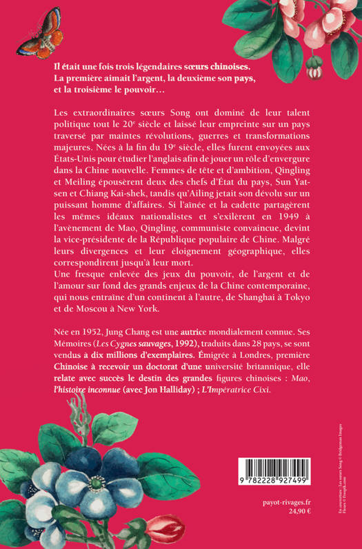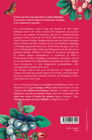 Les extraordinaires soeurs Song ont dominé de leur talent politique tout le 20è siècle et laissé leur empreinte sur un pays traversé par maintes révolutions, guerres et transformations majeures. Nées à la fin du 19ème siècle, elles furent envoyées aux Etats-Unis pour étudier l'anglais afin de jouer un rôle d'envergure dans la Chine nouvelle. Femmes de tête et d'ambition, Qingling et Mailing épousèrent deux des chefs d'Etat du pays, Sun Yatsen et Chiang Kai-shek, tandis qu'Ailing jetait son dévolu sur un puissant homme d'affaires. Si l'aînée et la cadette partagèrent les mêmes idéaux nationalistes et s'exilèrent en 1949 à l'avènement de Mao, Qingling, communiste convaincue, devint la vice-présidente de la République populaire de Chine. Malgré leurs divergences et leur éloignement géographique, elles correspondirent jusqu'à leur mort. Une fresque enlevée des jeux de pouvoir, de l'argent et de l'amour sur fond de grands enjeux de la Chine contemporaine, qui nous entraîne d'un continent à l'autre, de Shangai à Tokyo et de Moscou à New York.