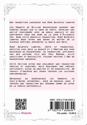 Une traduction lumineuse par René Quintrie Lamothe Les Sonnets de William Shakespeare ouvrent une fenêtre unique sur le cœur du poète, révélant une amitié passionnée avec un noble anglais et des sentiments pour une dame de la cour d’Élisabeth Ire. Dans cette nouvelle traduction, René Quintrie Lamothe nous offre une œuvre de maître où la rigueur poétique rencontre la magie des mots. René Quintrie Lamothe, poète et traducteur, restitue avec brio la beauté et l’émotion des vers originaux de Shakespeare. Sa traduction, applaudie par des auteurs tels que Paul Morand, allie exactitude et musicalité, faisant revivre l’âme du Shakespeare amoureux. Cette édition offre non seulement une traduction précise et inspirée, mais également une préface captivante, riche en analyse et en sensibilité. Un travail d’orfèvre qui saura toucher les lecteurs contemporains. Découvrez ou redécouvrez les Sonnets, ce chef-d’œuvre intemporel, sous un nouveau jour, à travers une traduction qui résonne comme un joyau de la poésie universelle.