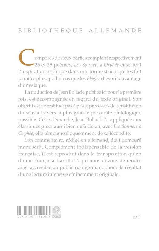 Composes de deux parties comptant respectivement 26 et 29 poemes, Les Sonnets a Orphee enserrent l'inspiration orphique dans une forme stricte qui les fait paraitre plus apolliniens que les Elegies d'esprit davantage dionysiaque. La traduction de Jean Bollack, publiee ici pour la premiere fois, est accompagnee en regard du texte original. Son objectif est de restituer pas a pas le processus de constitution du sens a travers la plus grande proximite philologique possible. Cette demarche, Jean Bollack l'a appliquee aux classiques grecs aussi bien qu'a Celan, avec Les Sonnets a Orphee, elle temoigne eloquemment de sa fecondite. Son commentaire, redige en allemand, etait demeure manuscrit. Complement indispensable de la version francaise, il est reproduit dans la transposition qu'en donne Francoise Lartillot a qui nous devons de rendre ainsi accessible au public non germanophone le resultat d'une lecture intensive eminemment originale.