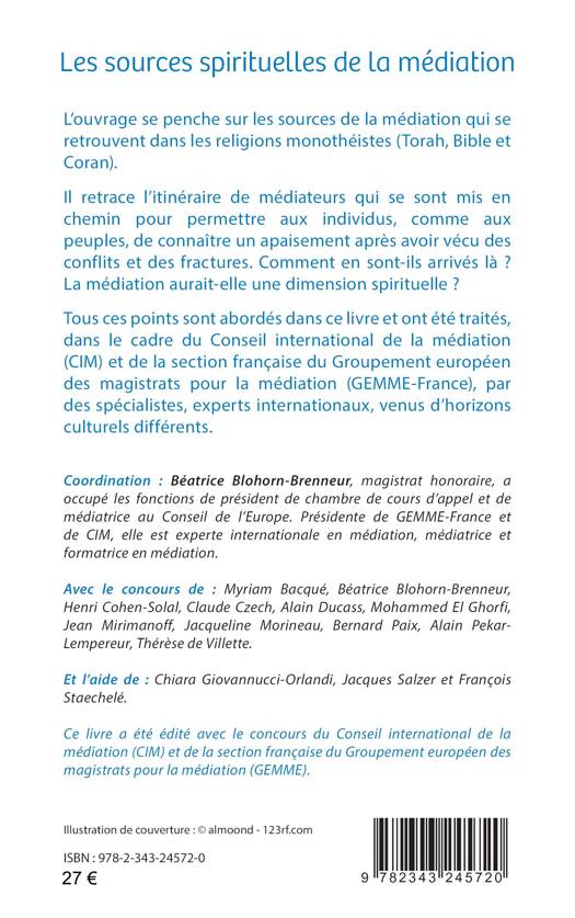 chemin pour permettre aux individus, comme aux peuples, de connaître un apaisement après avoir vécu des conflits et des fractures. Comment en sont-ils arrivés là ? La médiation aurait-elle une dimension spirituelle ? Tous ces points sont abordés dans ce livre et ont été traités, dans le cadre du Conseil international de la médiation (CIM) et de la section française du Groupement européen des magistrats pour la médiation (GEMME-France), par des spécialistes,experts internationaux, venus d’horizons culturels différents.