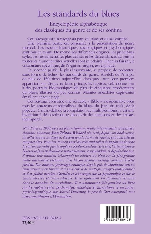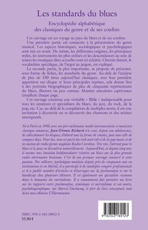 Cet ouvrage constitue une véritable « Bible » indispensable pour tous les amateurs et spécialistes du blues, du jazz, du rock, de la pop. Une première partie est consacrée à la présentation du genre musical : aspects historiques, sociologiques et psychologiques ainsi que les différentes origines, les principaux styles, les instruments les plus utilisés et les descendances au sein de toutes les musiques dites actuelles. La seconde partie, la plus importante, présente les standards du genre. Au-delà de l'analyse de plus de 150 titres aujourd'hui classiques, l'auteur livre des portraits biographiques de plus de 50 représentants du blues, illustres ou peu connus. Au-delà de la compilation de multiples noms, cet ouvrage est une invitation à découvrir ou re-découvrir des chansons et des artistes intemporels.
